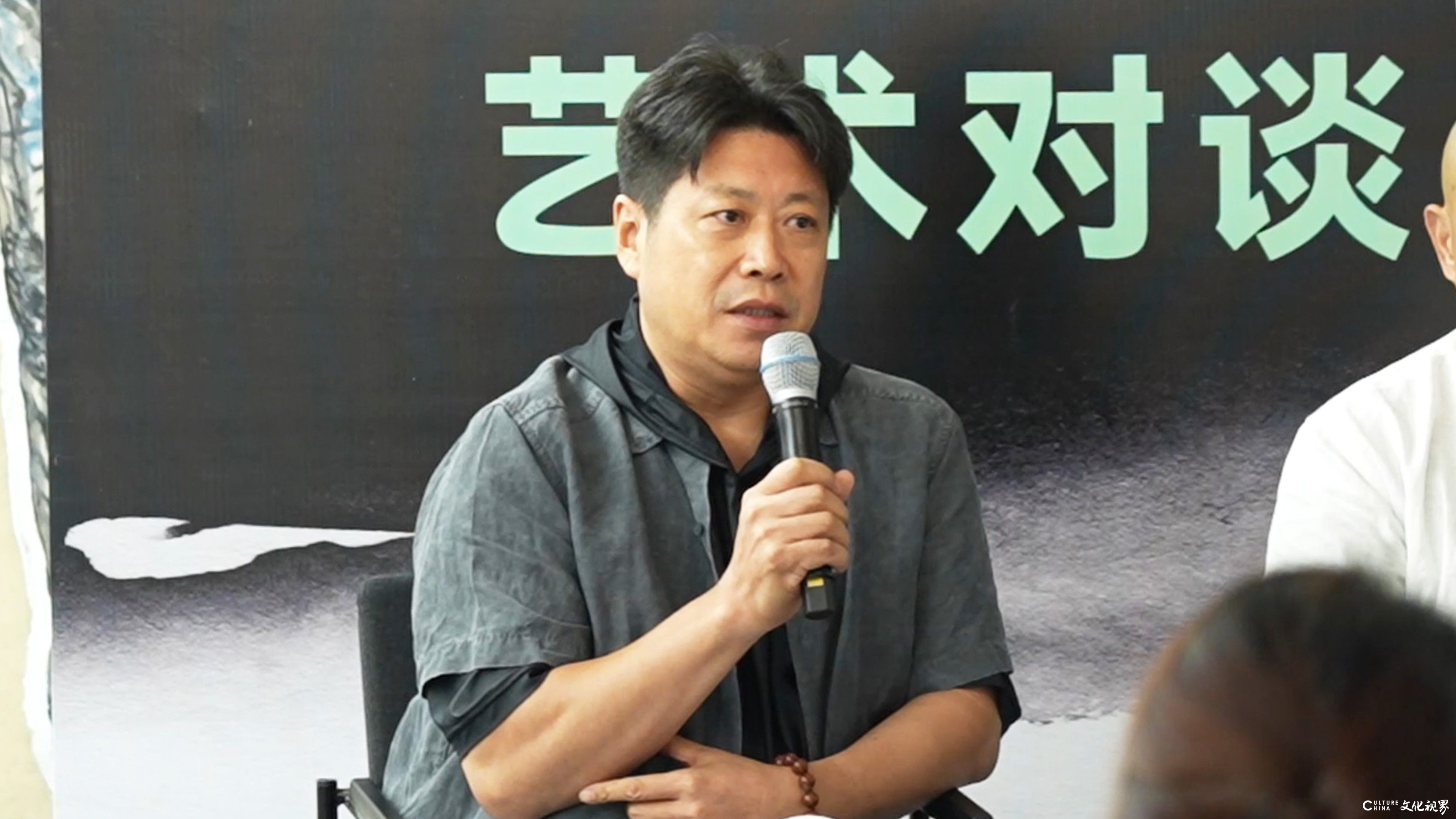 刚才尚可老师说了,我们墨局七人都来自不同的高校,其实中国艺术高等教育算下来不到百年,在这个发展过程中每个学校也都有代表性人物,他们的艺术成就和核心精神领着学校走,也影响了学术教育方向。像央美讲究把西方观念和中国文化融合,国美注重传统笔墨的延续,西安美院更关注现实生活,各有不同。我们七人里我是中央工艺美院毕业的,可能是唯一一个不是学国画的,但学校传统对我的影响很深。工艺美院的领头人吴冠中、张仃,他们都不是学国画的,一来学术背景不同,二来工艺美院一直强调艺术要服务社会,接受新事物、新的设计语言,这些其实都影响着学院方向。所以我们在学习过程中,对传统的吸收好像比别的院校差一些,这对我是个缺憾,但也让我没那么多束缚,能按自己的思路追求艺术。“墨局”每到一个地方,跟当地的学术大家们交流,每次展览后我们也都会产生新思考、新创作。从第一站到现在,作品差不多换了一半了,所以我认为这联展的形式特别好,让我们能跟当地的名家交流,一方面感谢大家的参与,另一方面也真心希望听到专业的批评,你们的鼓励让我们有信心,批评更能帮助我们校正方向,这都是我们内心需要的。